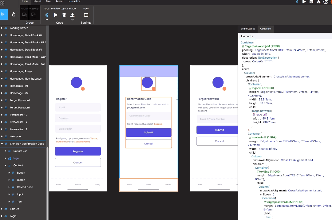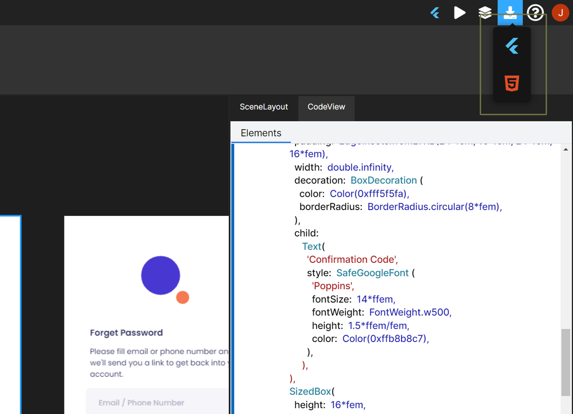 Don’t forget that previews are available for not only the screens and container but also for code view as well. After checking the codes, download it by clicking ‘Flutter’ from the ‘Export’ button on the top menu.