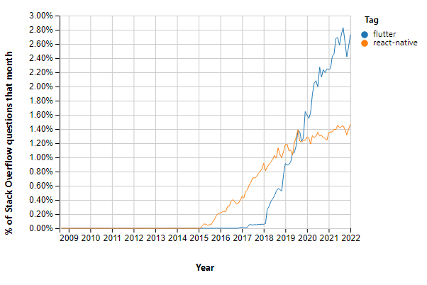 Flutter is recognized as the most popular frontend framework used by mobile app developers as it allows them to develop cross-platforms fast with good performance. In addition, many developers have already adopted Flutter as the main framework used for mobile app development, and the number is going up even now. The graph below proves its popularity.